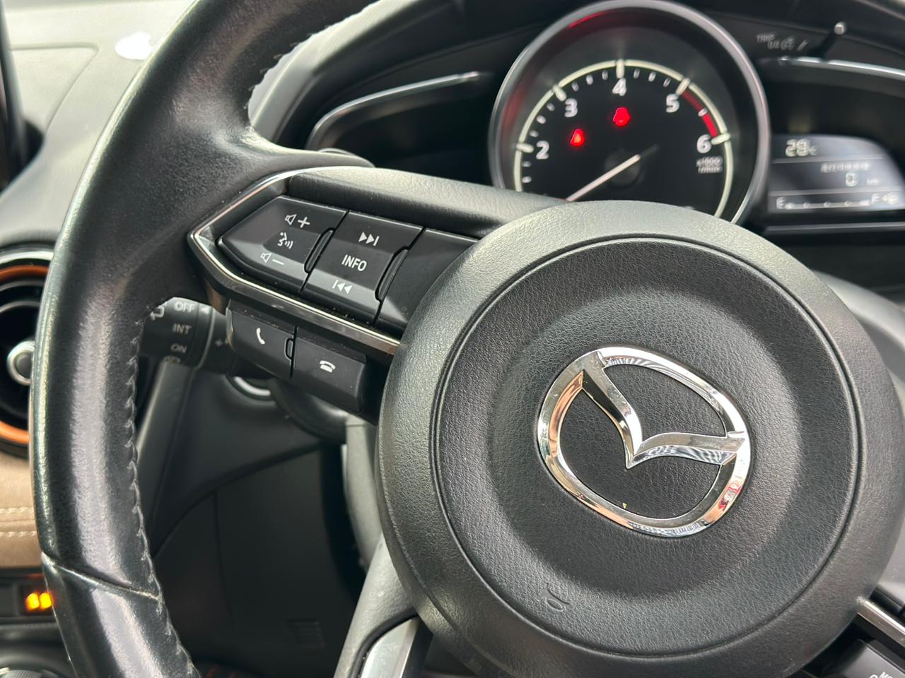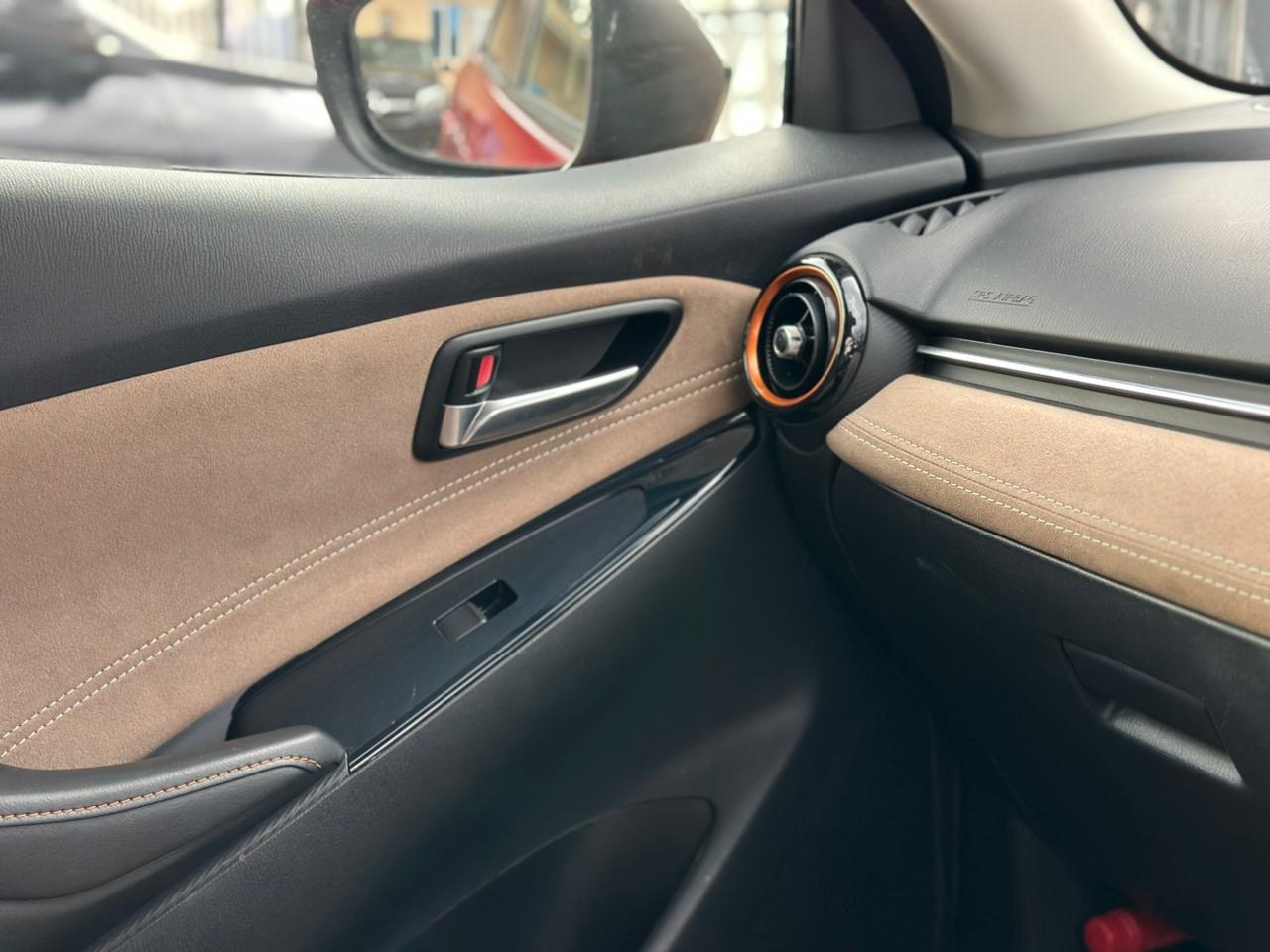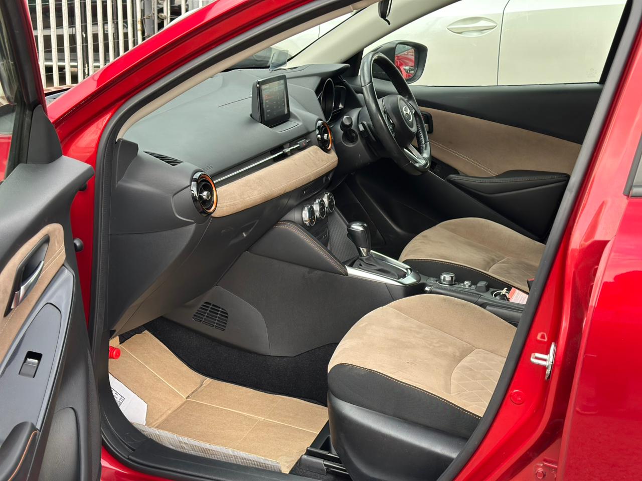The 2018 Mazda Demio Diesel Sports is a fully loaded compact hatchback featuring a 1.5L turbocharged diesel engine. It boasts modern features such as a Heads-Up Display (HUD), xenon headlights, lane departure assistance, traction control, heated seats, and a stylish brown interior with bumper and side body kits.