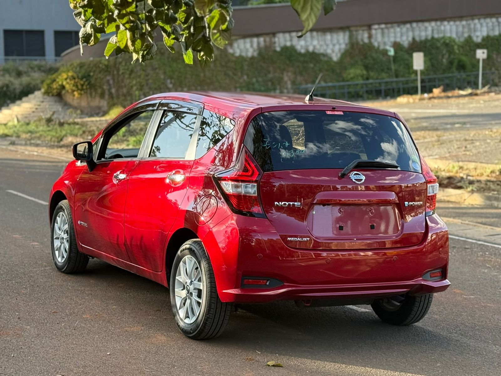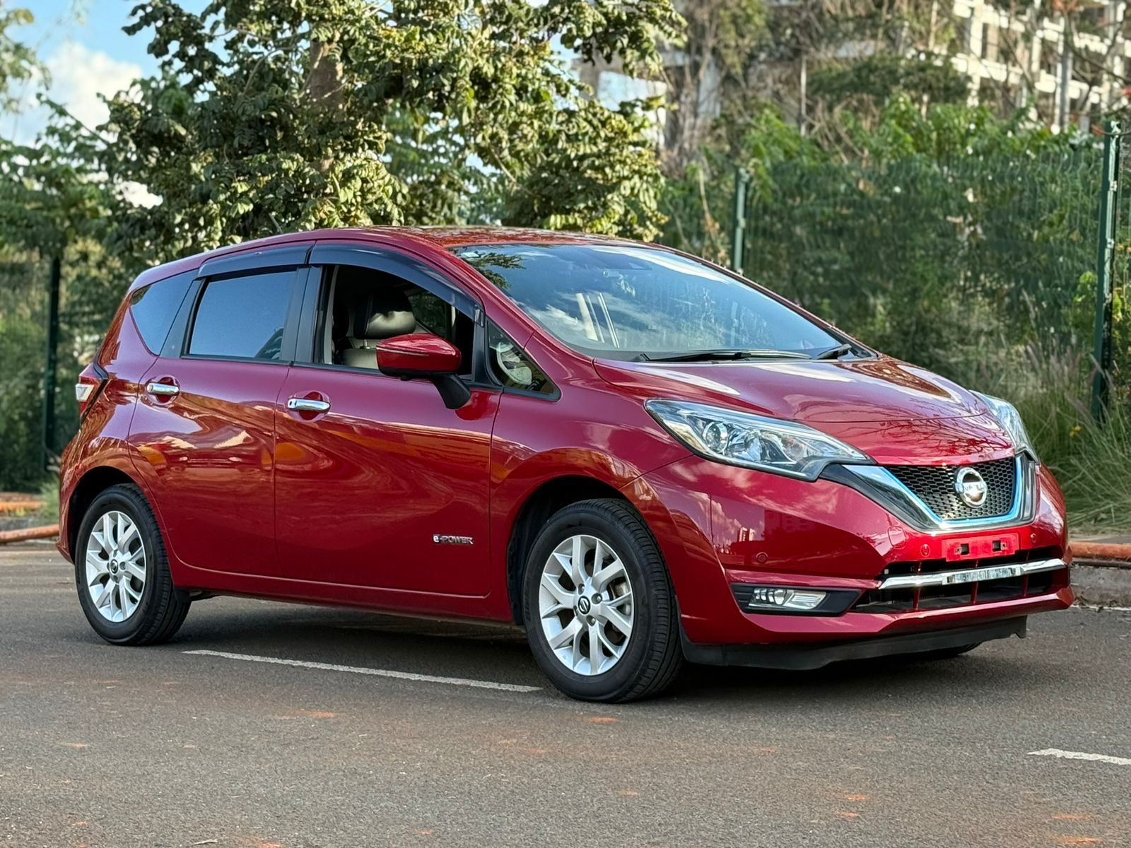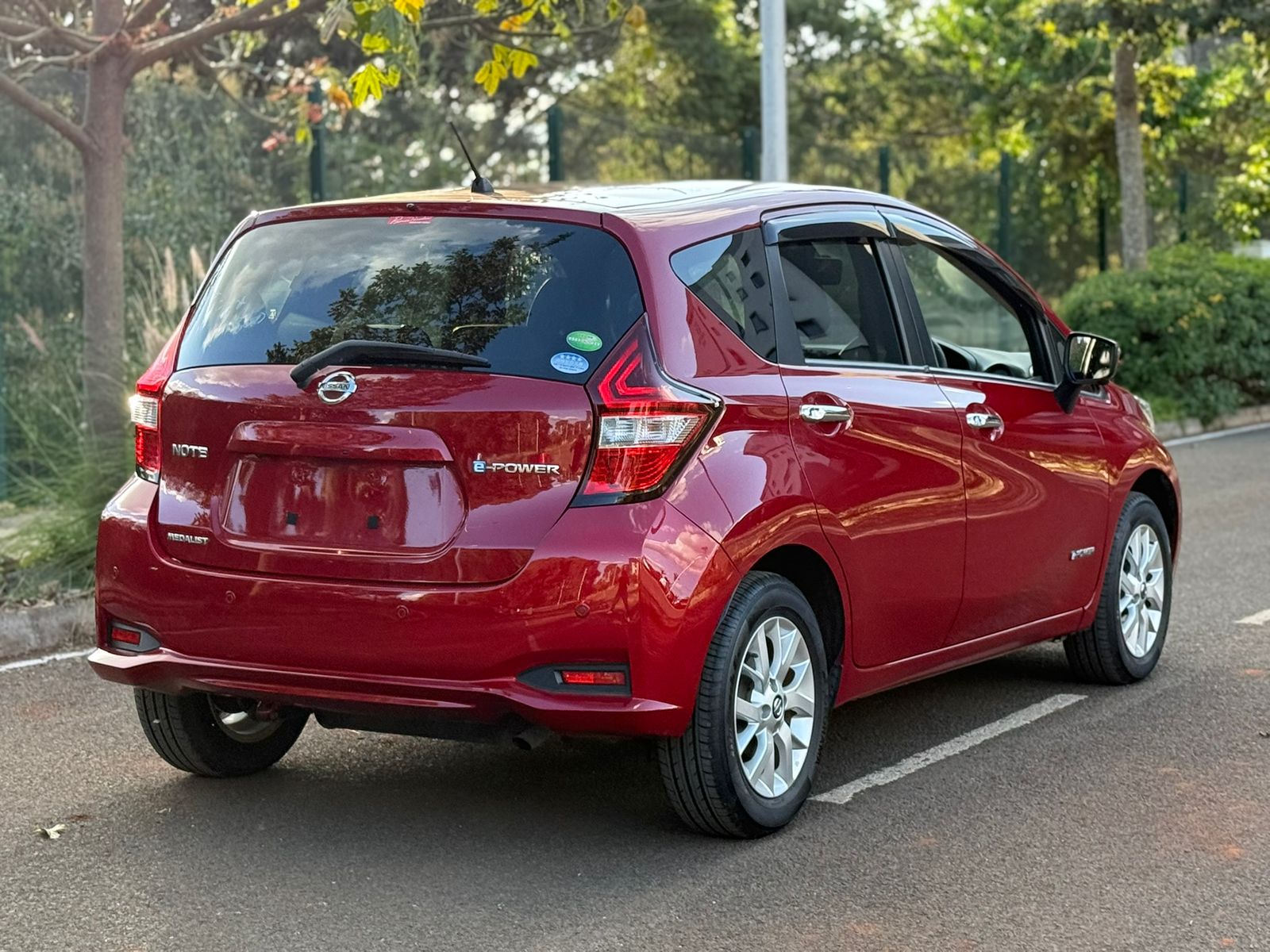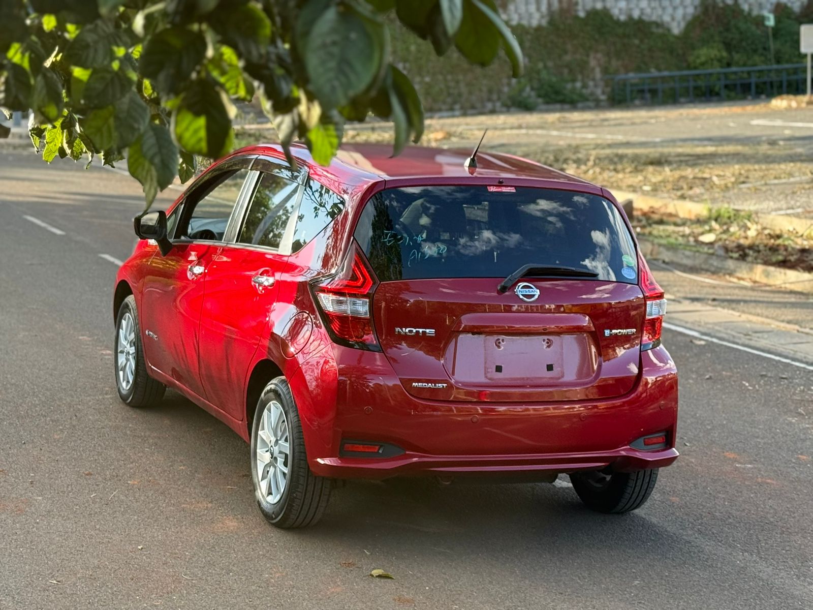 The 2018 Nissan Note Medalist E-Power in red is a hybrid subcompact hatchback powered by a 1.2L petrol engine paired with an electric motor system that drives the wheels fully electrically. It has 82,000 kilometers and offers a highly efficient and smooth driving experience, combining the benefits of electric propulsion with petrol engine battery charging. This model features a half-leather interior, advanced safety systems, and modern technology to deliver convenience and security.