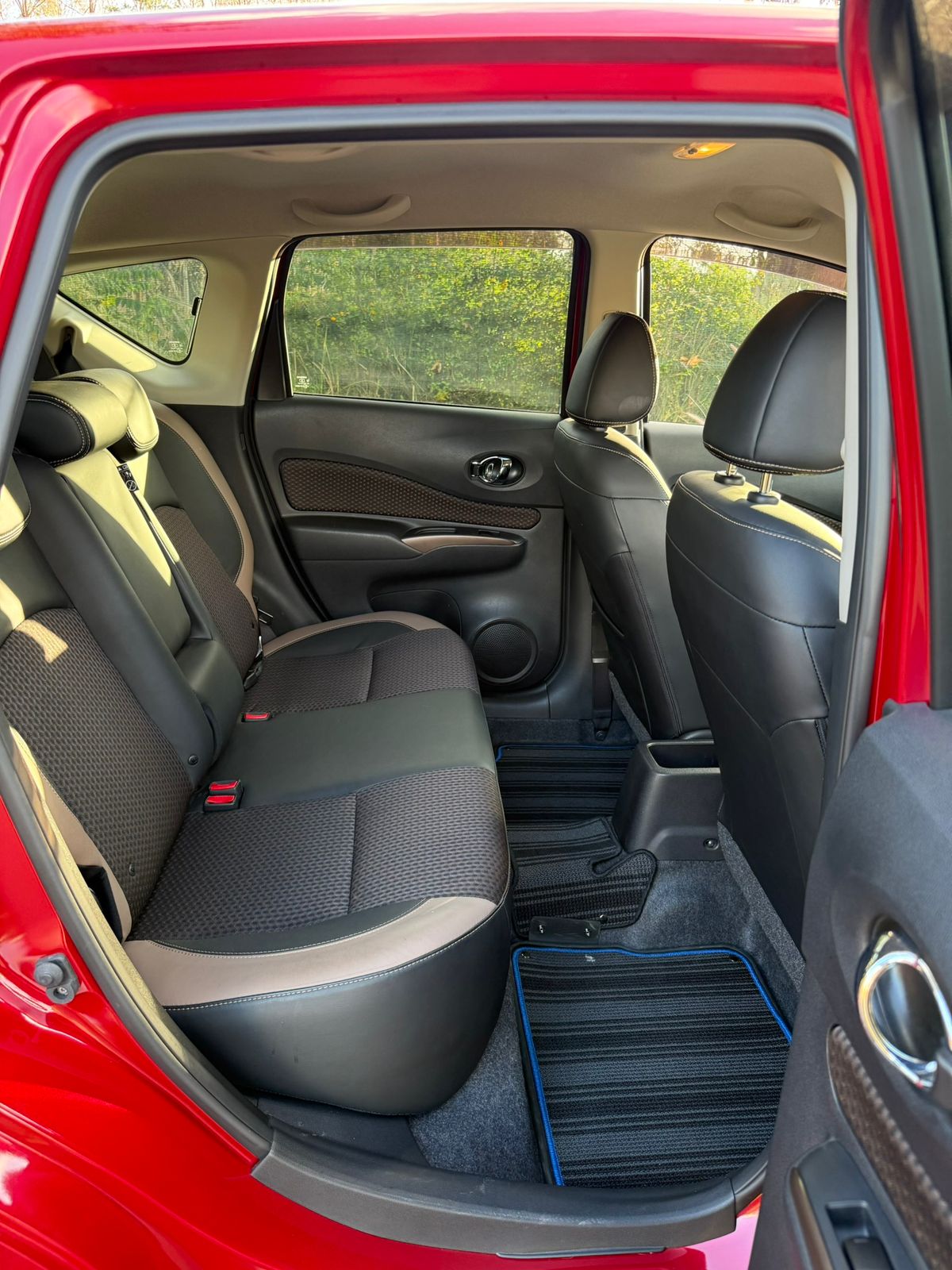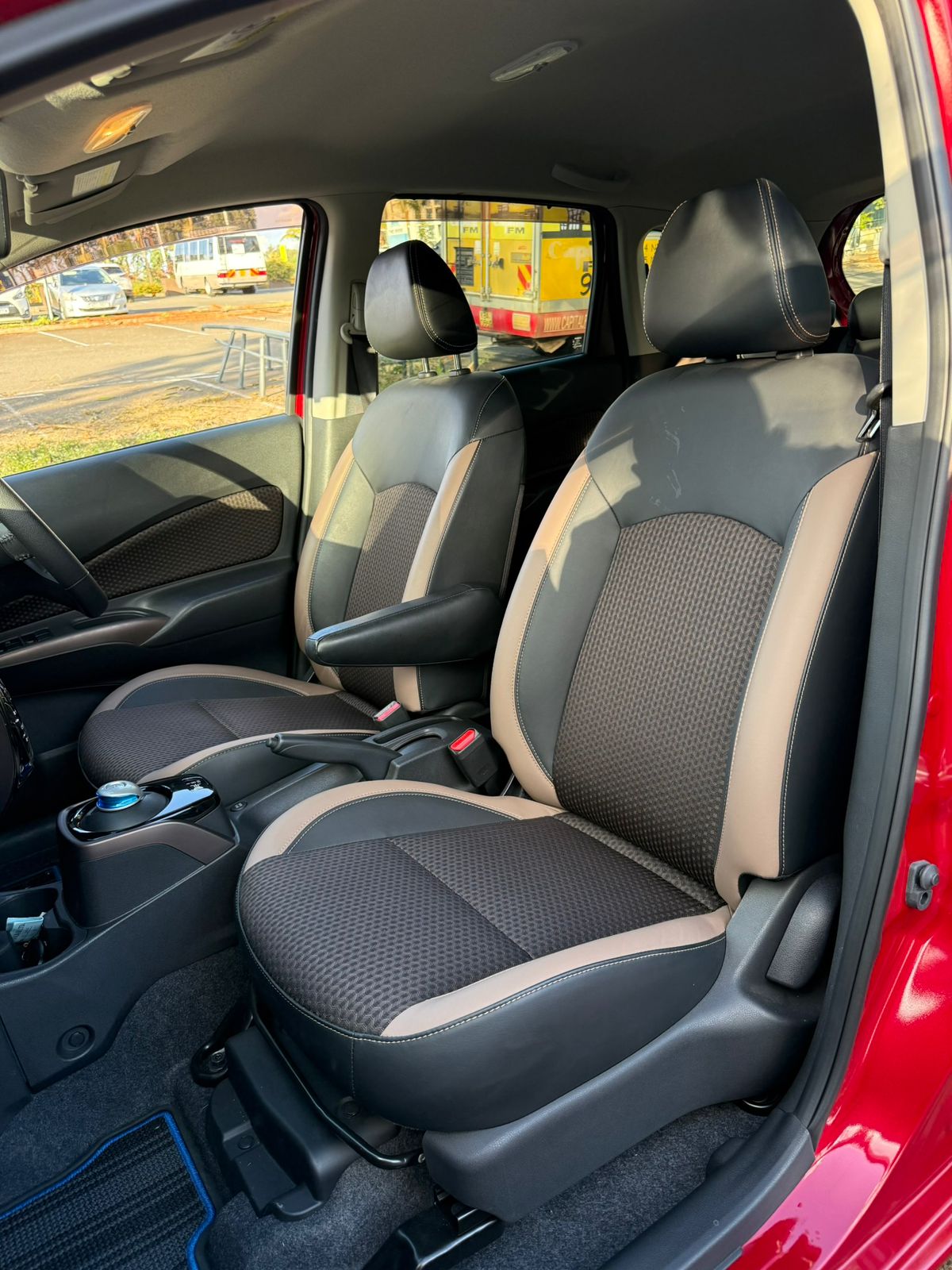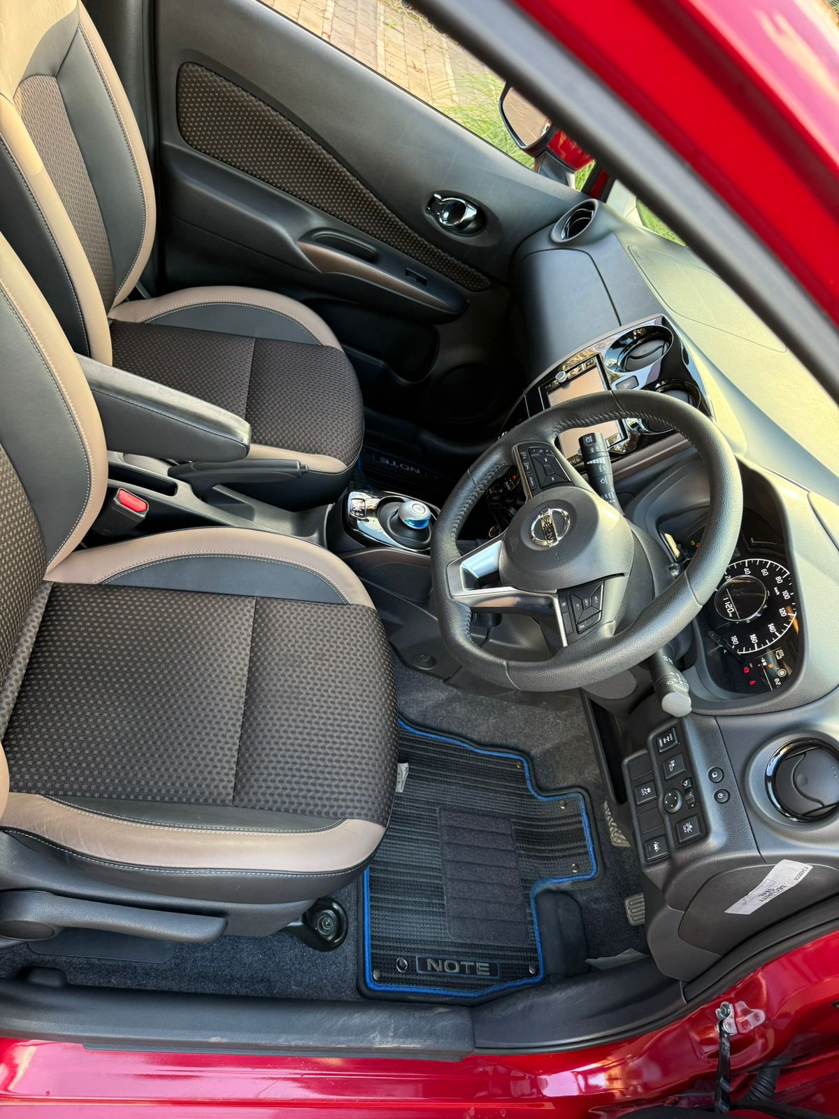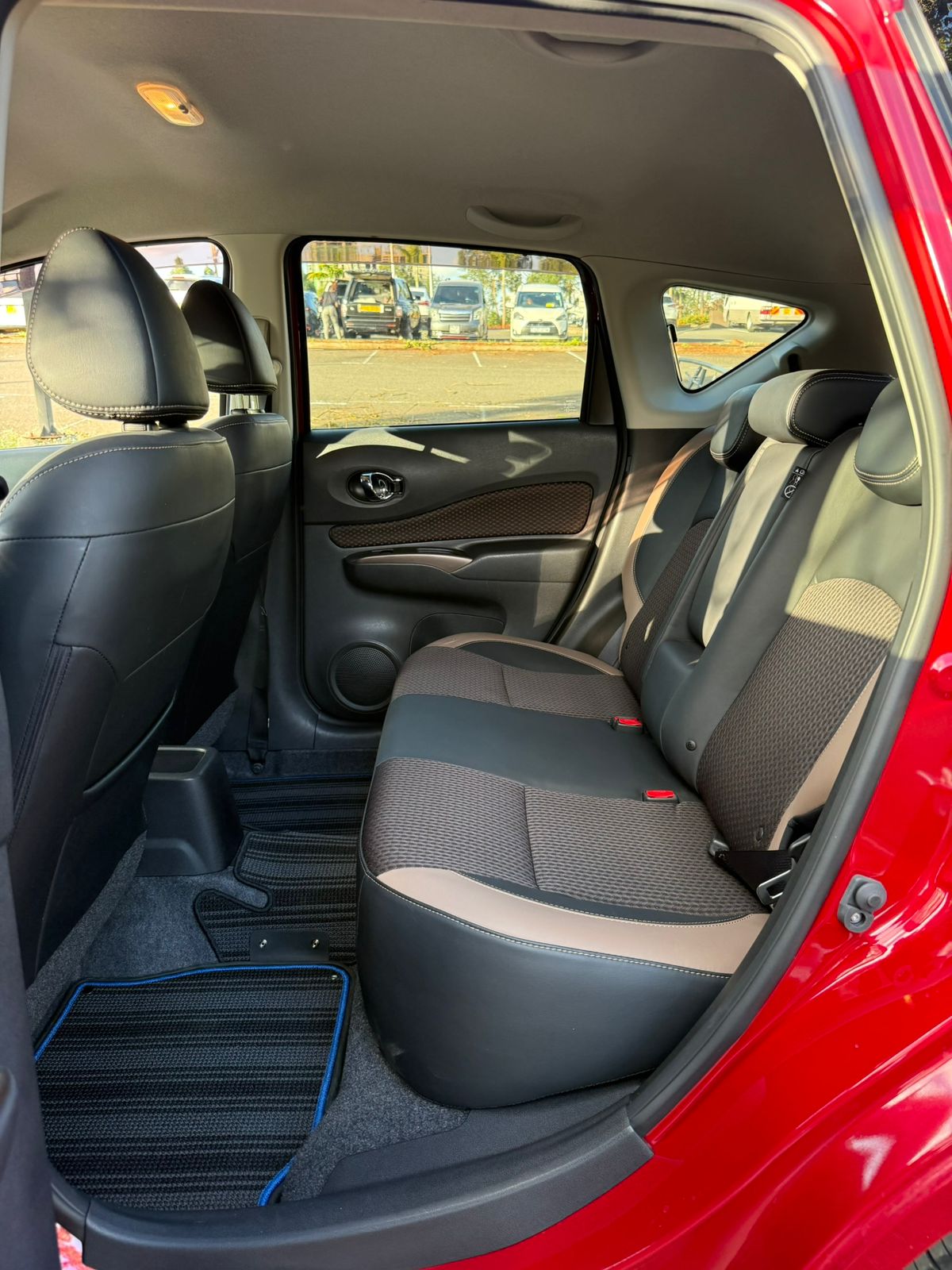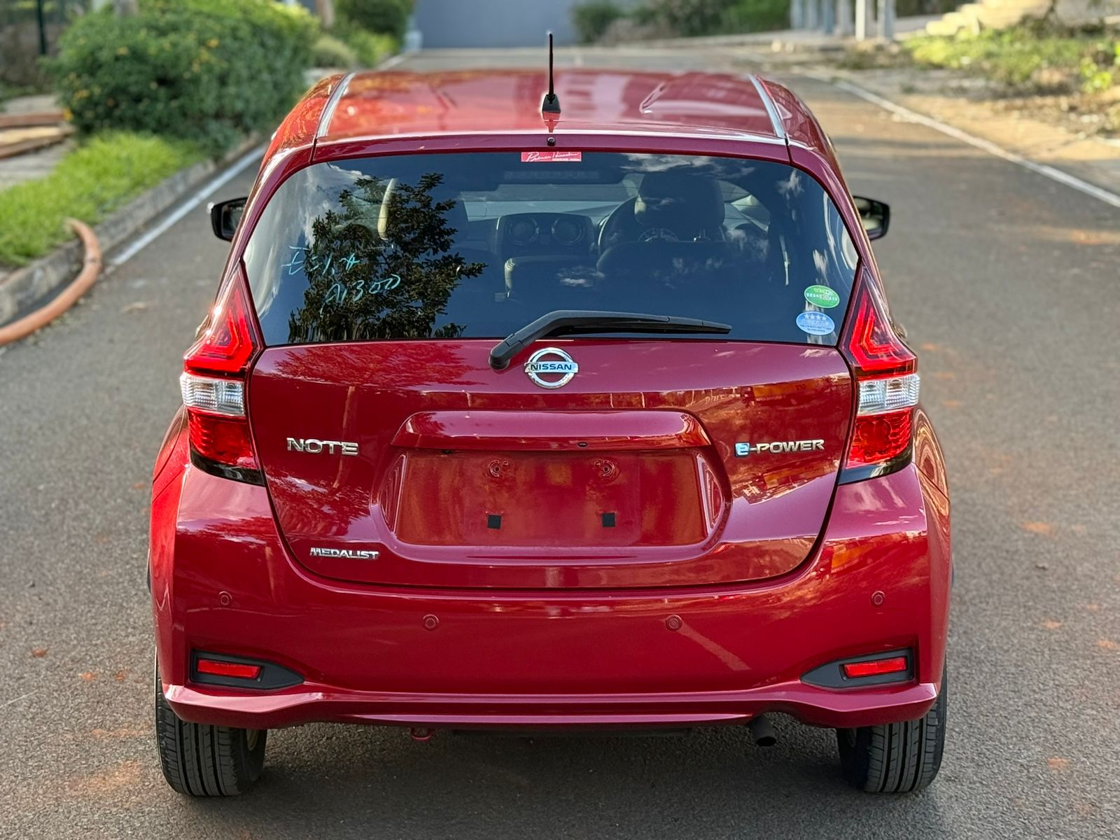 The 2018 Nissan Note Medalist E-Power in red is a hybrid subcompact hatchback powered by a 1.2L petrol engine paired with an electric motor system that drives the wheels fully electrically. It has 82,000 kilometers and offers a highly efficient and smooth driving experience, combining the benefits of electric propulsion with petrol engine battery charging. This model features a half-leather interior, advanced safety systems, and modern technology to deliver convenience and security.