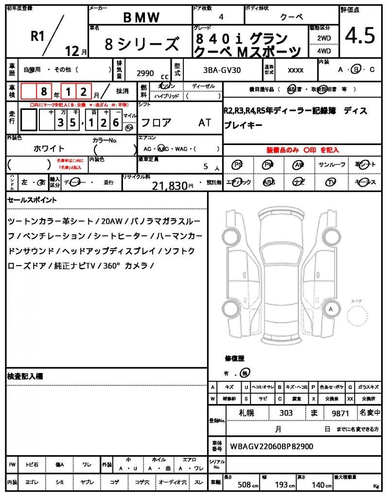 The 2019 BMW 8 Series 840i Gran Coupe M Sport is a high-performance luxury sedan with a striking sporty design, powered by a 3.0-liter turbocharged inline-6 petrol engine. Featuring two-tone stitched leather seats, it offers an elegant and dynamic driving experience. Having travelled 35,000 kilometers and graded 4.5/B, this model balances sportiness with sophistication, advanced technology, and premium comfort.