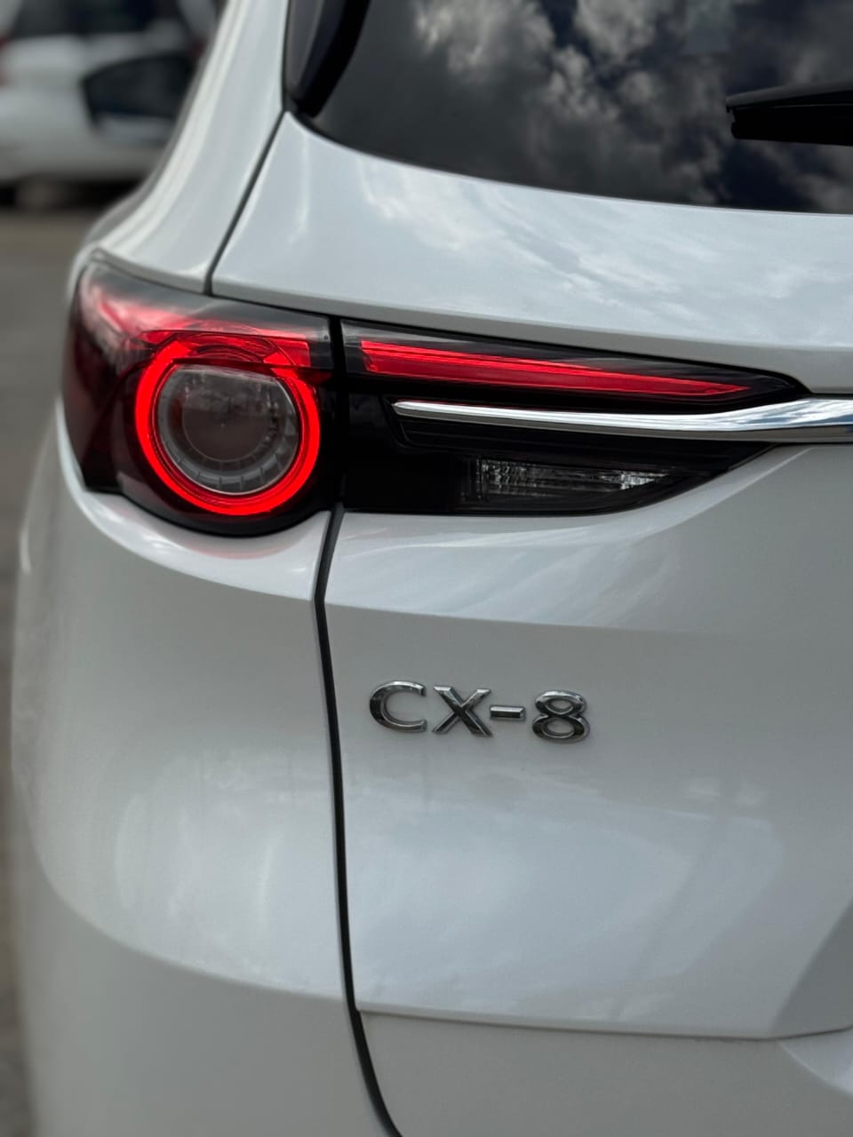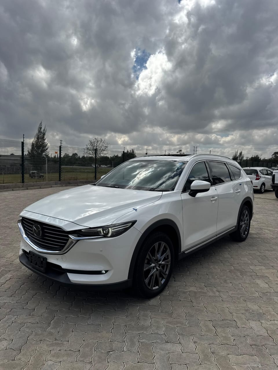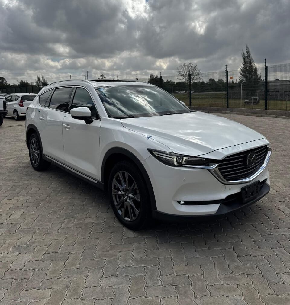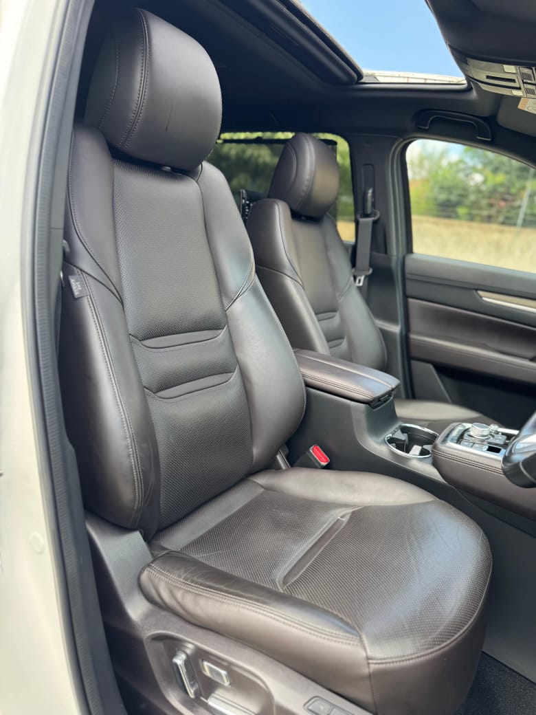 The 2019 Mazda CX-8 is a midsize luxury SUV offering a diesel engine option with a focus on spaciousness, technology, and comfort. This model features brown leather seats with headrest screens, a new digital instrument cluster, a panoramic sunroof, and a premium BOSE sound system, making it suitable for family and executive use.
