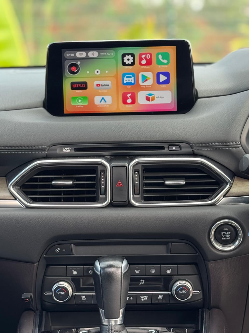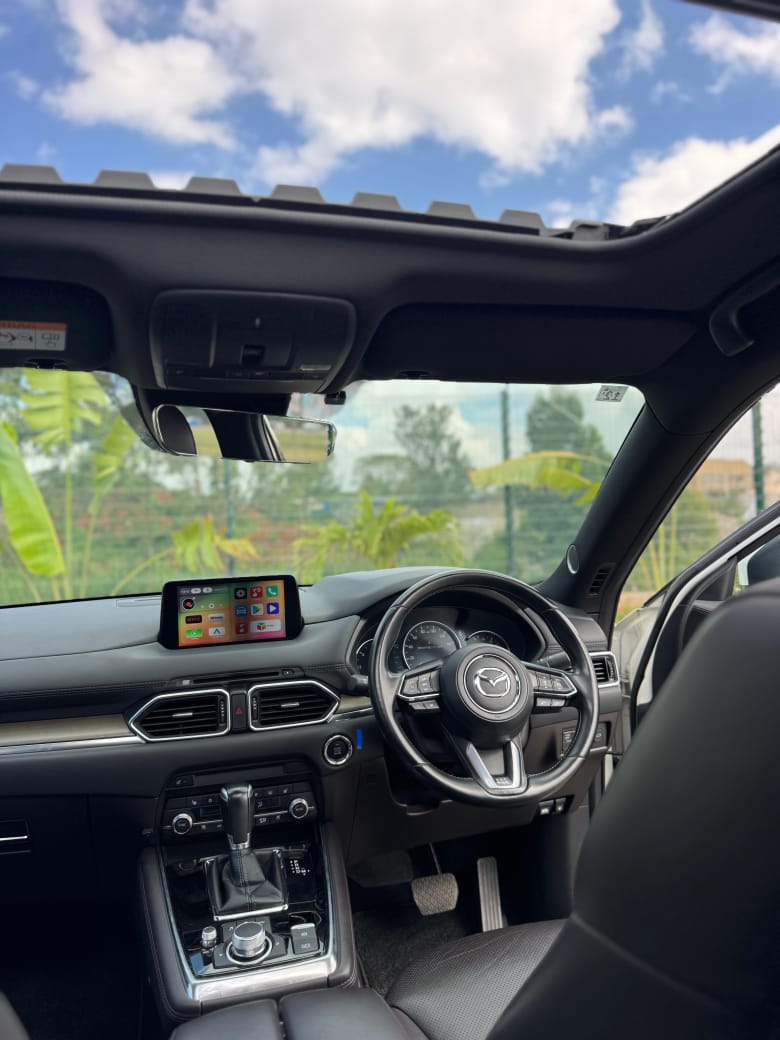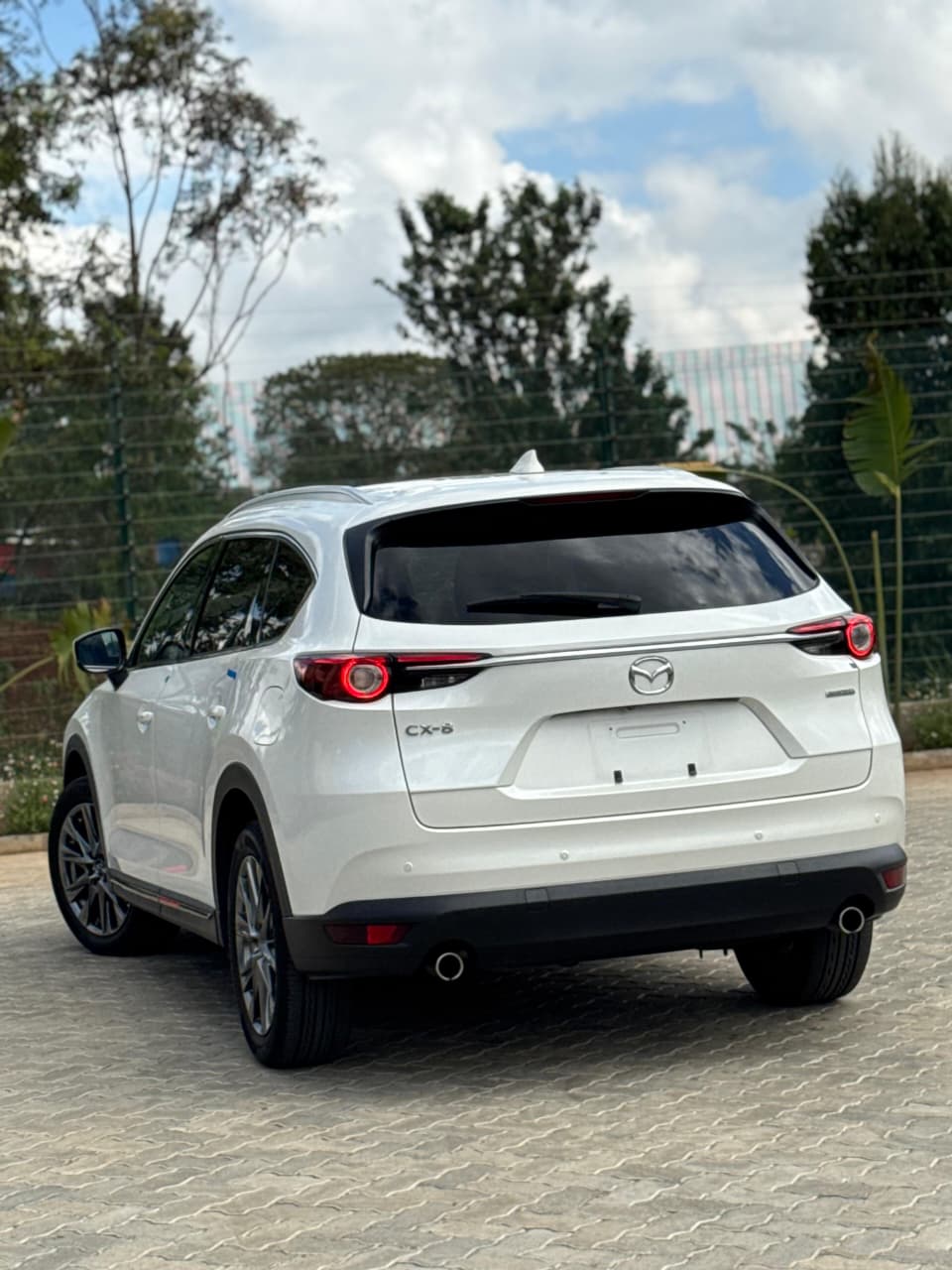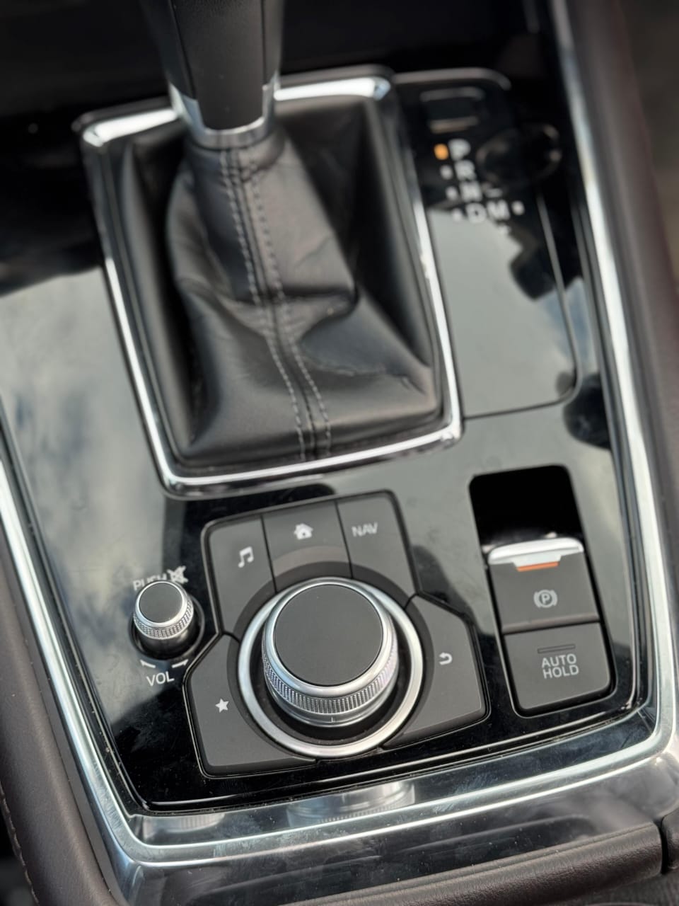 The 2019 Mazda CX-8 is a midsize luxury SUV offering a diesel engine option with a focus on spaciousness, technology, and comfort. This model features brown leather seats with headrest screens, a new digital instrument cluster, a panoramic sunroof, and a premium BOSE sound system, making it suitable for family and executive use.