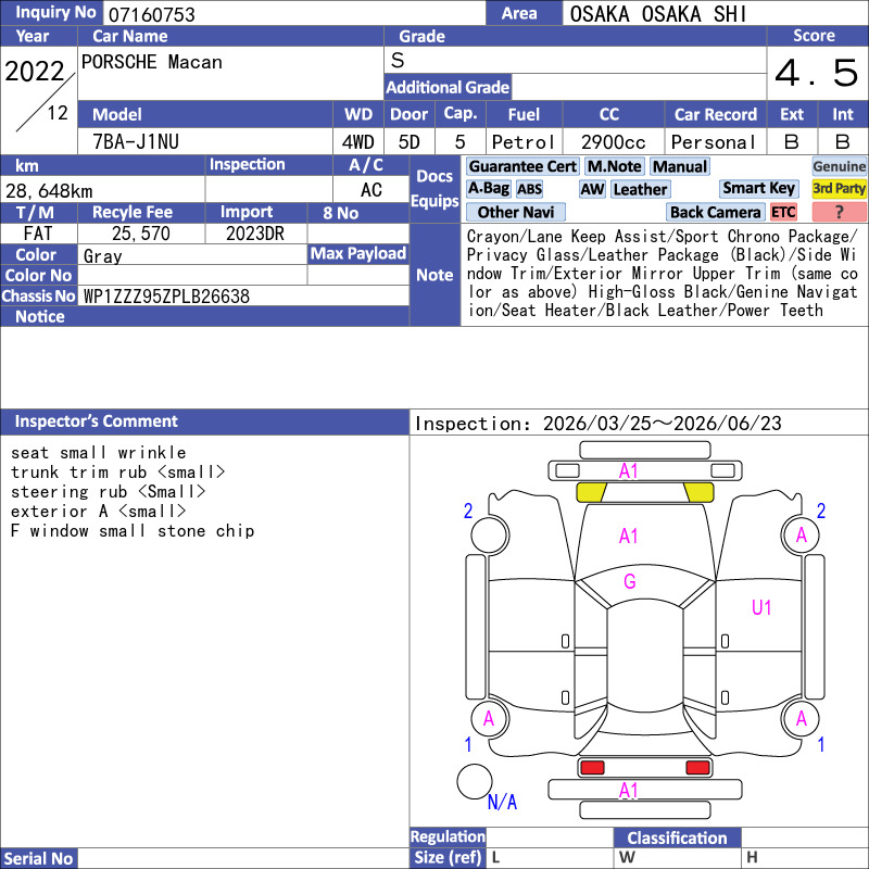 The 2022 Porsche Macan S is a high-performance luxury compact SUV powered by a 2.9L twin-turbo V6 petrol engine delivering 280 kW (375 hp) and 520 Nm torque, paired with a 7-speed PDK dual-clutch automatic transmission and all-wheel drive. This vehicle has only 28,648 kilometers and features a sophisticated black leather interior, graded at an excellent 5/A condition.