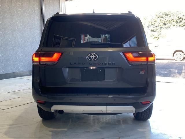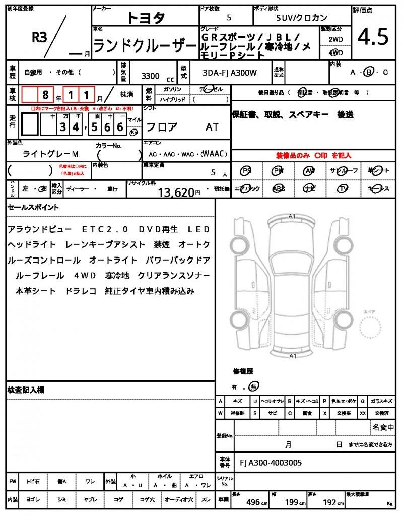 The 2023 Toyota Land Cruiser 300 Series GR Sport is a high-performance luxury SUV powered by a 3300 cc twin-turbo diesel V6 engine. The vehicle has traveled 34,566 km, features a black exterior, and is fitted with GR Sport two-tone leather seats, a sunroof, and a cooler box. It carries a grade of 4.5/B, indicating very good condition.