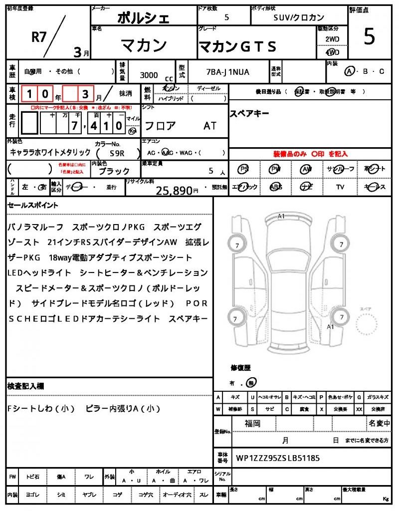 The 2025 Porsche Macan GTS is a powerful, luxurious compact SUV featuring a 2.9L twin-turbo V6 petrol engine paired with a 7-speed PDK dual-clutch automatic transmission. This SUV comes with 7,410 kilometers, a black leather interior, and a grade of 5/A for excellent condition, combining sporty performance with premium refinement.