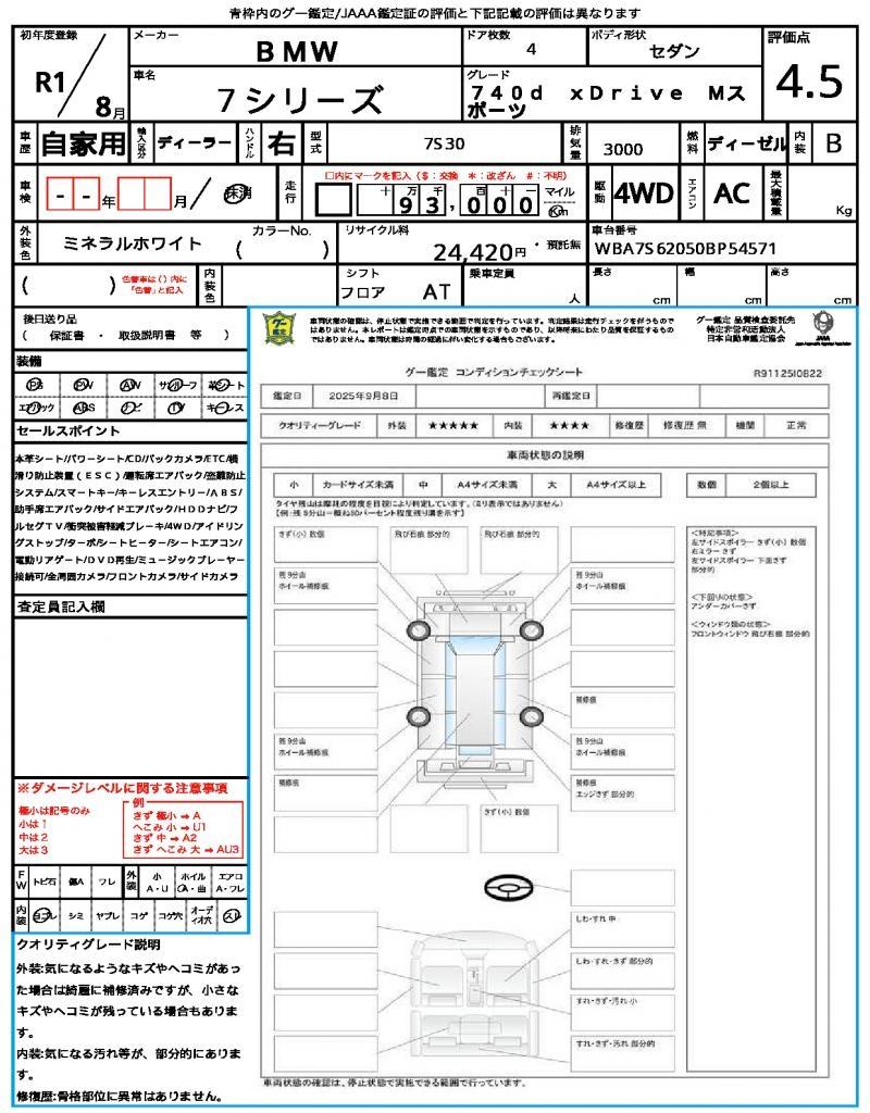 The 2019 BMW 7 Series 740d xDrive M Sport is a flagship diesel luxury sedan packing a potent turbocharged inline-6 and all-wheel drive for elevated performance and refinement. With 93,000 kilometers on the odometer, a dark leather interior, a sunroof, and a host of M Sport upgrades, this model blends executive comfort with dynamic handling. Graded 4.5/B, it sits among premium long-wheelbase sedans offering strong power, advanced tech, and luxury amenities.