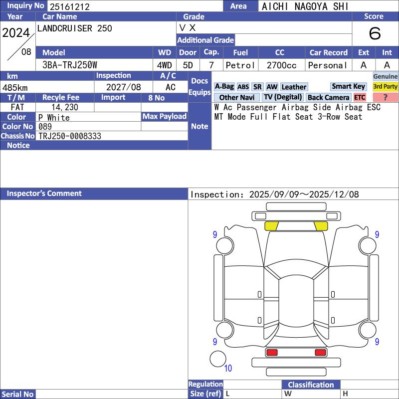 The 2024 Toyota Land Cruiser Prado VX TRJ250W is a premium 4x4 SUV designed for both urban and off-road use. It features a 2.7L petrol engine, delivering reliable power and versatility. This model, with only 485 km mileage, a sunroof, and a comfortable black interior, offers seven seats and modern convenience in a rugged package.