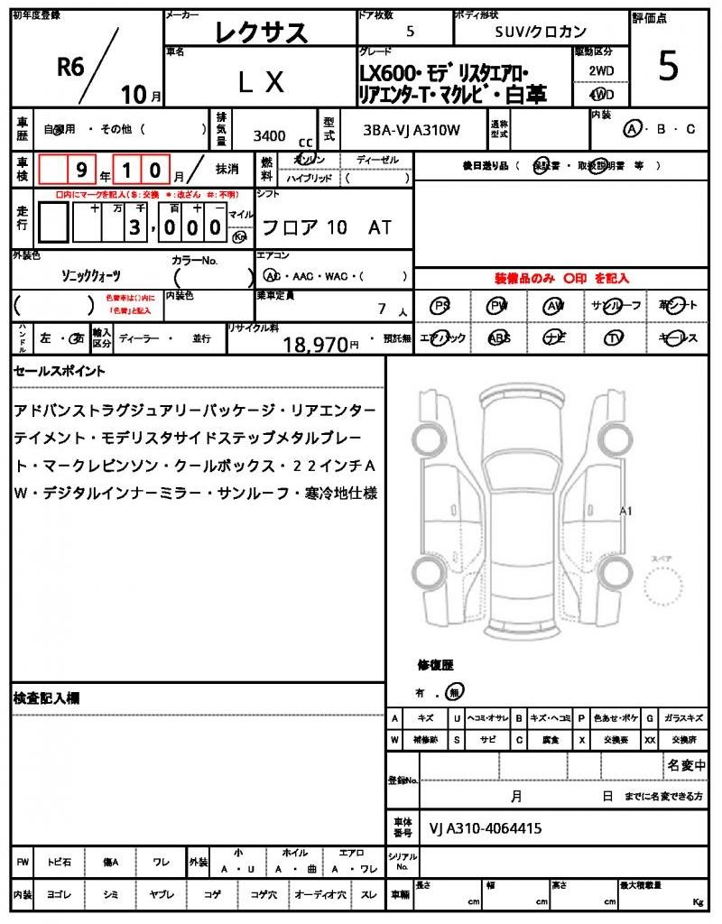 The 2024 Lexus LX600 is a flagship full-size luxury SUV powered by a 3.5L twin-turbo V6 petrol engine producing 409 hp and 479 lb-ft of torque. The vehicle has covered just 3000 km and features a stunning pearl exterior paired with genuine 7-seat brown leather upholstery. This model includes the exclusive Modellista Aero body kit, which enhances its bold and aggressive exterior styling, along with a panoramic sunroof that adds to the cabin's spacious and luxurious feel.