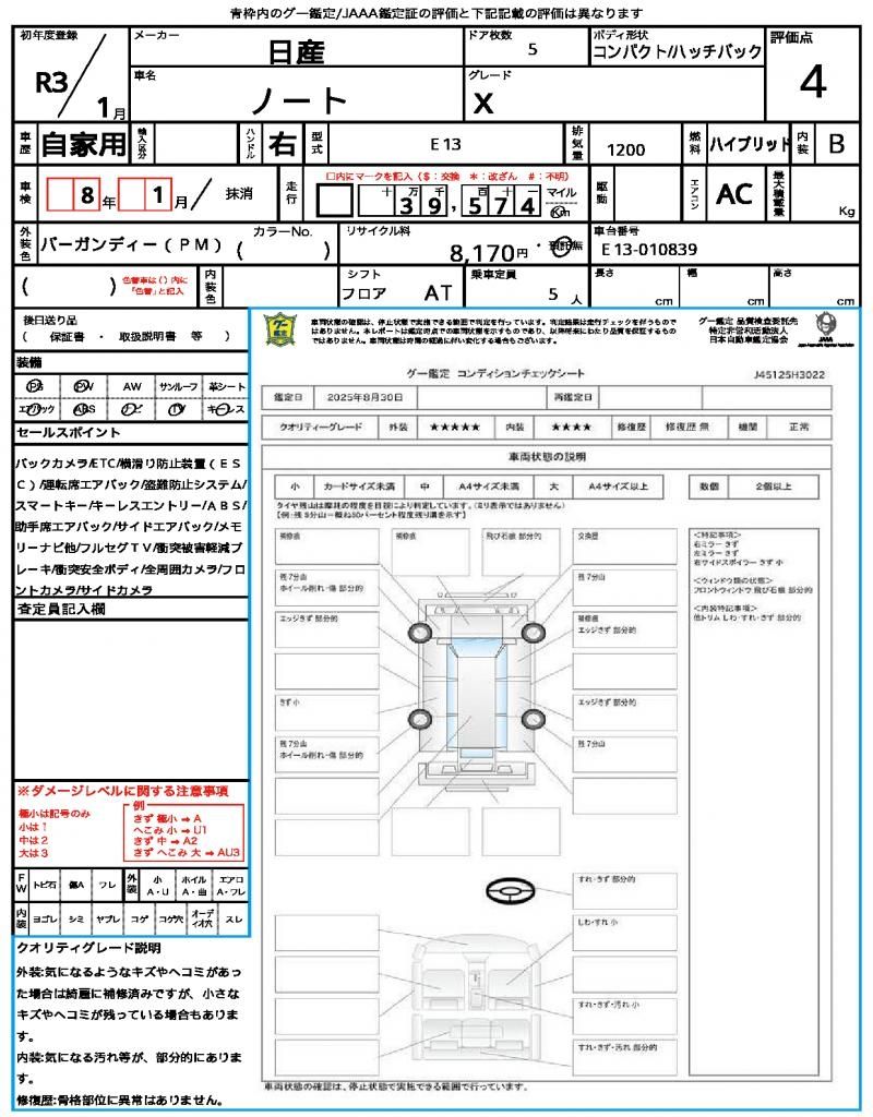 The 2021 Nissan Note X is a compact hatchback featuring a 1.2L petrol engine. With 39,000 km on the odometer and auction grade 4/B, this economical and practical car suits urban driving, offering good fuel economy and maneuverability in city environments.