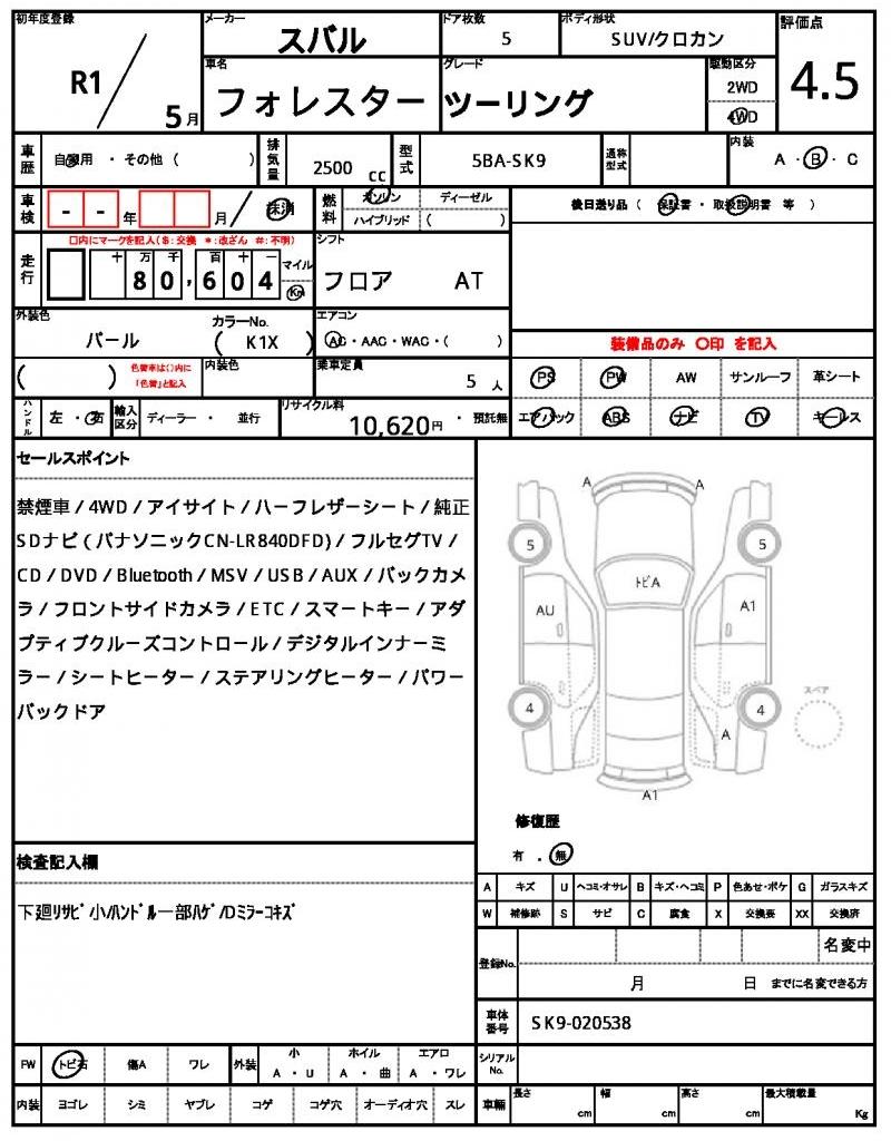 The 2019 Subaru Forester SK9 Touring is a premium compact SUV offering a refined blend of performance, safety, and comfort. Dressed in jungle green with 100,000 km mileage and a Grade 4.5/B condition, it appeals to drivers who want a versatile, reliable SUV equipped with Subaru's advanced features and all-wheel drive capability.