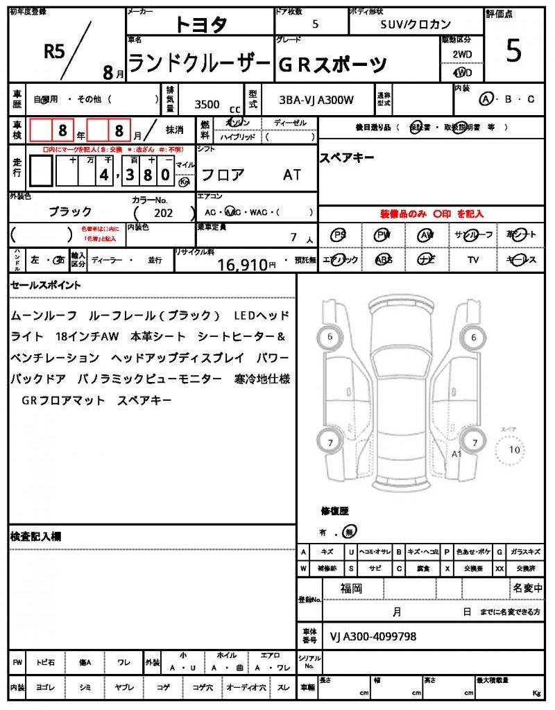 The 2023 Toyota Land Cruiser ZX 300 Series GR Sport is a high-performance luxury SUV powered by a 3500 cc twin-turbo petrol V6 engine. This specific vehicle has traveled 4,380 km, features a black exterior, and has GR Sport two-tone leather seats, accompanied by a sunroof and a cooler box. It is graded 5/A, indicating excellent condition.